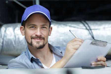 Portrait of warehouseman with clipboard checking delivery, stock in warehouse.