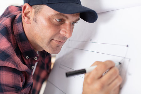 man on construction site drawing with pencil wearing white hat security helmet safety working protective equipment
