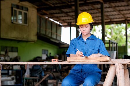 Asian technician girl with blue suit and yellow helmet use pencil to work with the wood.