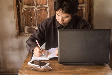 Asia Man Pen Write on book with glass, smart phone and notebook on table