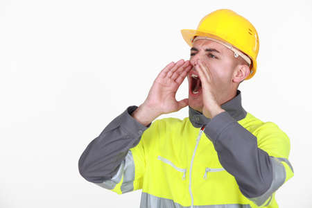 Side view portrait of angry coal miner shouting against a dark background