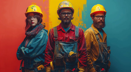 Portrait of diverse male construction workers in colorful uniforms posing confidently as a team against a plain backdrop.
