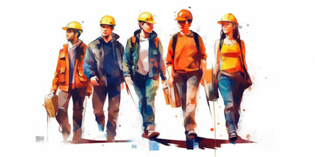 Workers in protective helmets, created with Generative AI technology.