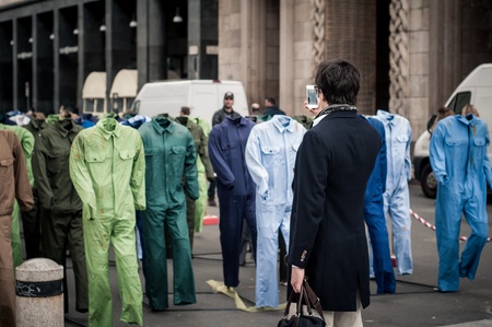 MILAN, ITALY - APRIL 23 art installation by Gianfranco Angelico Benvenuto in Milan on April, 23 2012 Installation 100 Sogni morti sul lavoro exposed in honor of dead on work in Milan Piazza Duomo