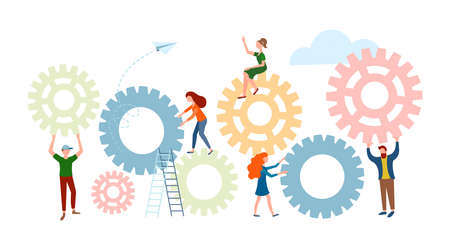 Office workers tiny people adjust gears. Conceptual vector illustration of workflow organization.