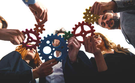 Strategy team solution teamwork partnership community alliance integration planning union concept. Groups of young people hold gear hands.