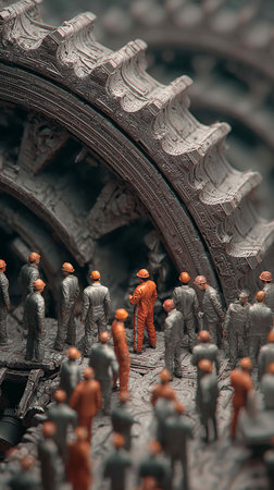 Miniature people at an industrial scene, depicting workers in a construction or machinery environment.