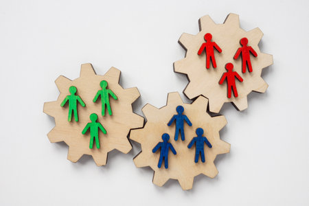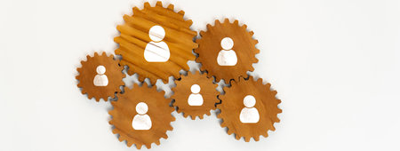 Teamwork and System Management Metaphor with Wooden Cogs and Figures