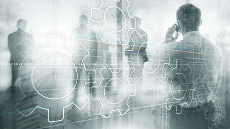 Double exposure gears mechanism on blurred background. Business and industrial process automation concept.
