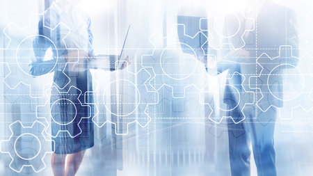 Business technology internet concept double exposure gears abstract background.