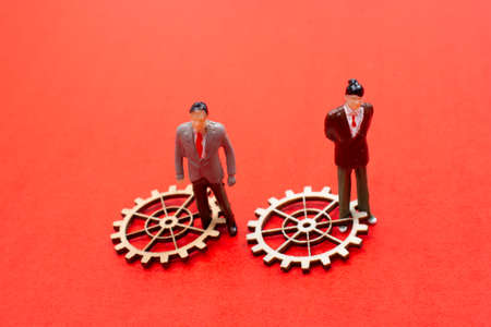 Conceptual photo of gears, coins and toy people. Business, law or political concept, which could represent decision making, leadership, teamwork and so on. Selective focus.