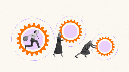 Contemporary art collage. Businesswoman pushing gears while businessman runs inside against light background. Concept of teamwork, organizational dynamics, corporate efficiency, and project execution.