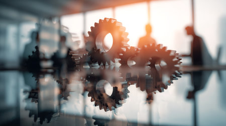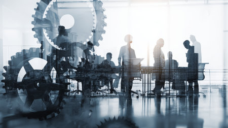 Double exposure of gears and machinery with business professionals in a light office setting