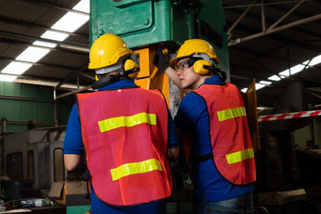 Monthly inspection of safety equipment : Engineering workers, engineers, technicians work as a team work, inspecting the use of hydraulic machinery in industrial plants for safety and efficiency.