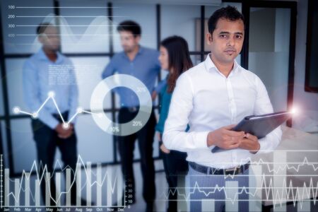 Indian team member leaving short briefing, his mix raced work group in background. Serious office worker holding folder with virtual business and financial charts around. Teamwork and meeting concept