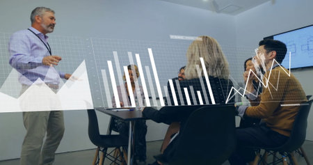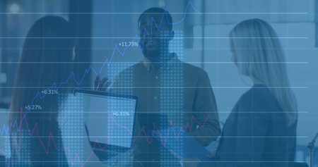 Financial data processing image over diverse business team discussing in office. Teamwork, collaboration, finance, data analysis, diversity, meeting