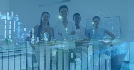 Image of financial data processing over diverse business people in office