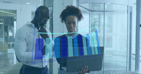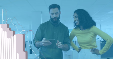 Reviewing professionals wearing business attire viewing bar chart overlay in office with smartphone. Collaboration, technology, data, innovation, teamwork, modernity, analytics