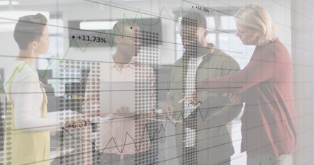 Image of multiple graphs and changing numbers, diverse coworkers talking in office. Digital composite, multiple exposure, report, business, discussion and technology concept.