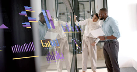 Image of stock market data processing over diverse colleagues discussing over document at office. Global economy and business technology concept