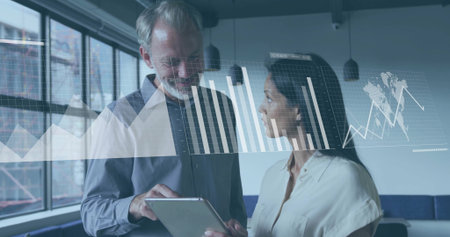 Image of data processing and diagrams over diverse colleagues discussing work. Business and digital interface concept digitally generated image.