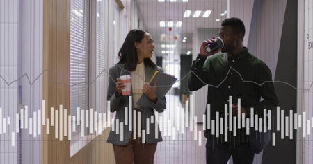 Image of financial graphs over diverse businesspeople walking in office. Business, working in office, finance and economy concept digitally generated image.