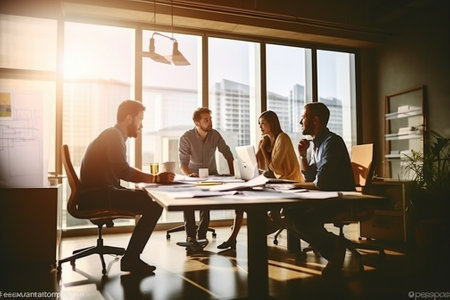 Back lit photo of business people in conference room standing sitting window city. Generative AI AIG19.