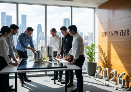 A team of architects collaboratively examine a detailed architectural model of a cityscape, likely discussing plans for a new development, with a Happy New Year 2026 backdrop.