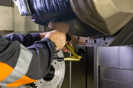 Close up hands of milling machine operator working in factory workshop. Turning lathe machine in turning workshop. Industrial theme. Metalworking and mechanical engineering. Turning lathe in action.