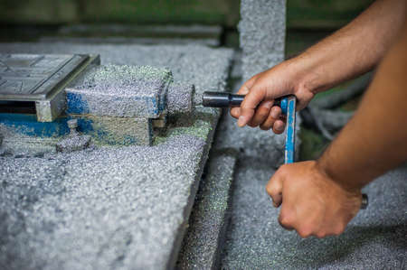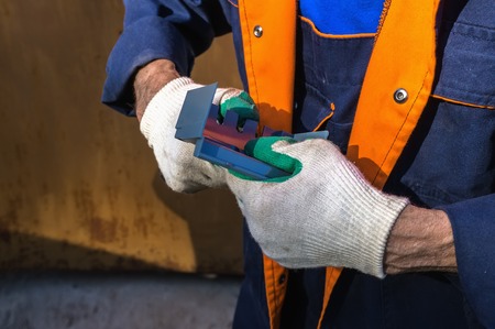 Metal worker with tool works in locksmith's shop of metalworking factory