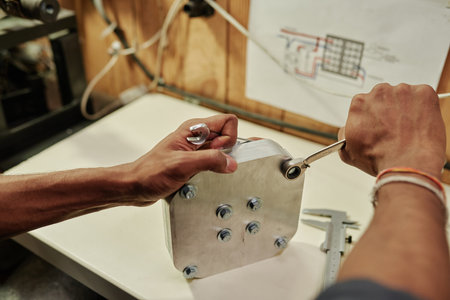Young unrecognizable technician of plastic recycling factory fixing nuts on parts of press mold with metallic wrench