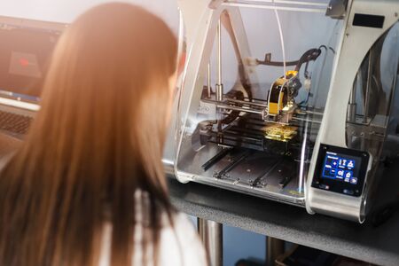 Technician controlling 3d printer creating prototype in laboratory
