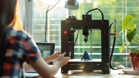 Female industrial designer works with 3D printer in design lab, showcasing integration of design and advanced manufacturing technology. The practical application of 3D printing in product development
