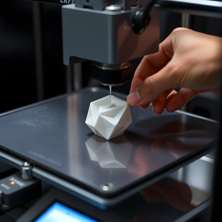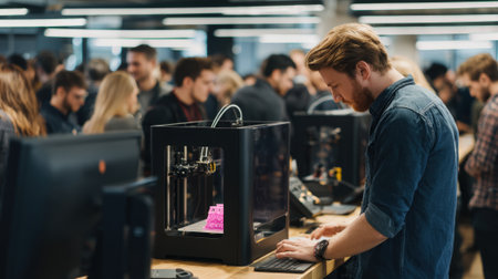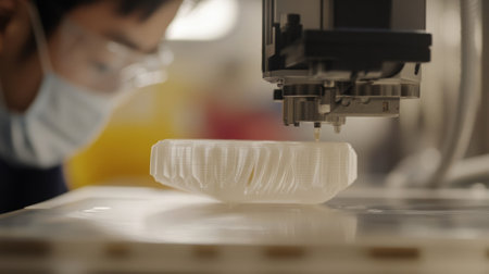 A person crafting a product using a 3D printer in a well-lit workspace. Perfect for maker culture, design, and modern craftsmanship visuals.