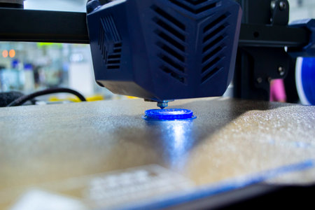 3D plastic printer during work in a factory three dimensional printing. Close-up detail.