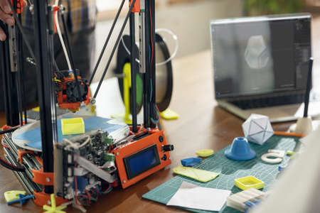 3D printer and tools on the laboratory desk: additive manufacturing, prototyping and engineering concept