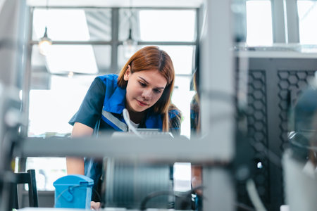 Young woman in white lab coat working with 3d printer