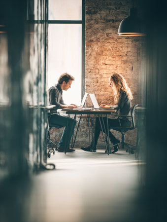 Two coworkers focus on their laptops in a stylish workspace, surrounded by soft lighting and a warm ambiance, promoting creativity and collaboration.