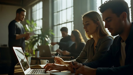 A group of professionals engages in a brainstorming session in a modern office. Laptops, notepads, and a small plant decorate the wooden table, fostering a productive atmosphere.