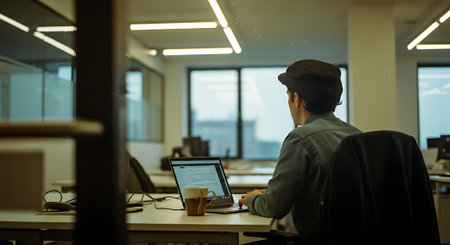 A man wearing a cap and jacket works on a laptop in a bright, modern office. A backpack is placed on the chair beside him.