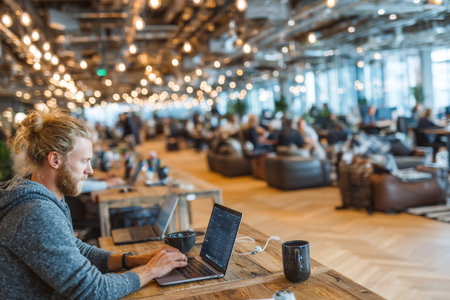 A man with long hair types on his laptop in a lively co-working area filled with people and cozy furniture. Warm lights create a welcoming atmosphere.