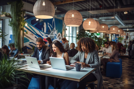 A diverse group of individuals occupied with their laptops as they collaborate and work together around a table, Creative team working together on a laptop in an open-concept office, AI Generated