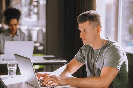 Serious young male economist analyzing financial papers in front of laptop by workplace in office against two busy coworkers