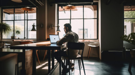A man is seated at a desk, engaged with a computer in a workplace setting, The contrast between traditional offices and teleworking, AI Generated