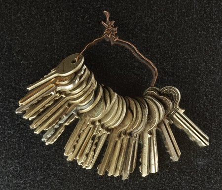 A bunch of old worn keys hanging on the screw on the grey concrete wall