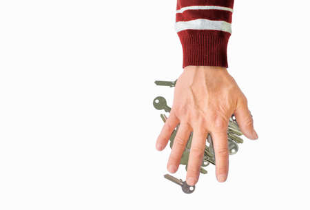 A big bunch of keys, laid out in a circle, from the different locks, lies on a plane white background, copy space.