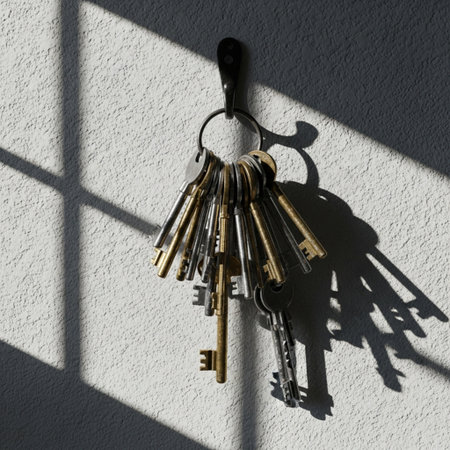 House keys hang in the hallway. The man hangs the keys back in place after just coming home.