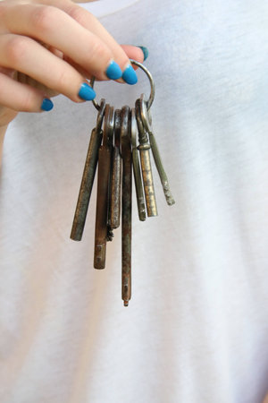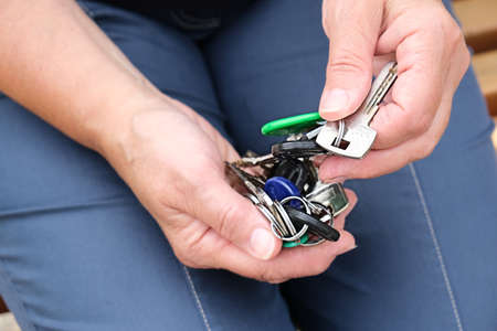 A bunch of door keys on hands of senior woman. The concept of memory and difficult choices
