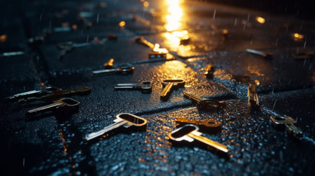 An AI generated illustration of numerous vintage keys of various shapes and sizes on a dark surface