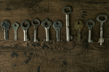Overhead top down view of a collection of different vintage keys spread out on an antique wooden table. The keys vary in design and patina, each one telling a story of its past use.